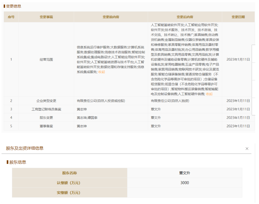 除此之外,工商信息显示该公司企业类型由“有限责任公司 (自然人投资或控股)”变为“有限责任公司 (自然人独资)”,而原股东黄志坤、谭国泰退出,改由覃文升全资持股;而且该公司法定代表人、执行董事兼经理由黄志坤变更为覃文升。
