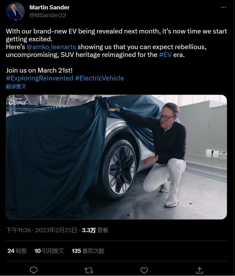 2 月 27 日消息,福特欧洲设计总监 Amko Leenarts 宣布,该品牌将于 3 月 21 日推出一款基于 MEB 架构的跨界新车型,这是是福特与大众计划推出的两款合作车型中的第一款。