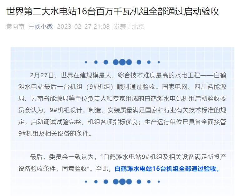 原标题:世界第二大,白鹤滩水电站 16 台机组全部通过验收:中国水电技术登顶世界“珠峰”