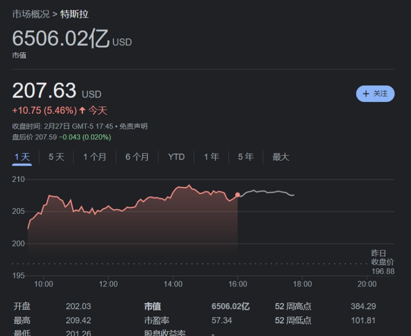 2 月 28 日消息,周一美股收盘,特斯拉股价大涨 5.46% 来到 207.63 美元每股,市值达到了 6506.02 亿美元。也正因此,特斯拉 CEO 埃隆・马斯克 (Elon Musk) 再次夺回了世界首富的宝座。