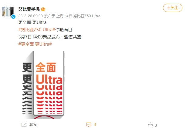 原标题:努比亚 Z50 Ultra 手机官宣 3 月 7 日发布:更全面,更 Ultra