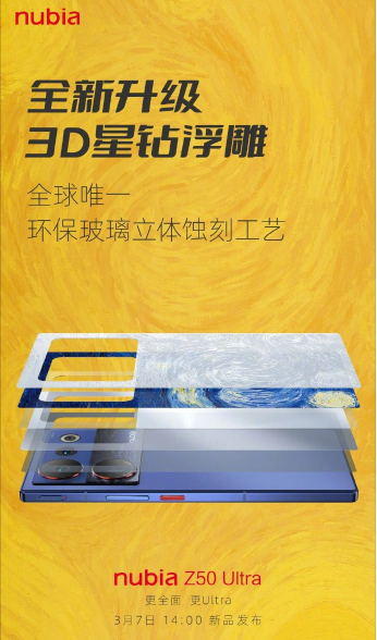 3 月 4 日消息,中兴努比亚 Z50 Ultra 手机将于 3 月 7 日 14:00 发布。今天努比亚手机官宣,将推出努比亚 Z50 Ultra 星空典藏版,全球唯一环保玻璃立体蚀刻工艺,采用纳米级光刻纹理 AG 玻璃材质,带来科技与艺术的碰撞。