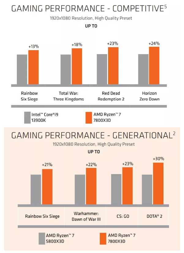 如上图所示,AMD 将 R7 7800X3D 和 i9-13900K 和 R7 5800X3D 进行了对比,测试的游戏是《彩虹 6 号》《战锤 战争黎明 3》《CS:GO》和《DOTA2》,测试的分辨率为 1080p,高画质。根据 AMD 的数据,R7 7800X3D 在四款游戏中领先 i9-13900K 13%-24%,领先 R7 5800X3D 21% - 30%。