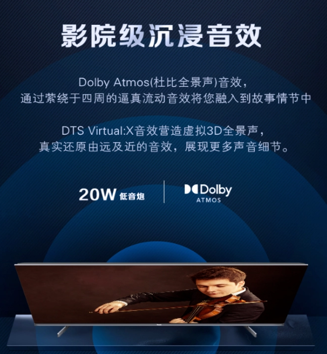 98 英寸 LX880C 使用了双 15W 的扬声器外加一个 20W 的低音炮,加入了杜比全景声和 DTS Virtual : X 双音效;支持远近场 AI 语音功能,通过“你好!松下”的语音指令,解锁语音控制。