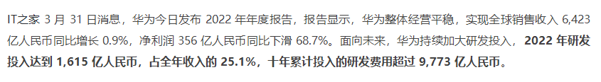 3 月 31 日消息,华为今日发布 2022 年年度报告,报告显示,华为整体经营平稳,实现全球销售收入 6.423 亿人民币同比增长 0.9%,净利润 356 亿人民币同比下滑 68.7%。面向未来,华为持续加大研发投入,2022 年研发投入达到 1.615 亿人民币,占全年收入的 25.1%,十年累计投入的研发费用超过 9.773 亿人民币。
