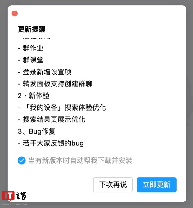 4 月 14 日消息,腾讯新 QQ for Mac 发布了 v6.9.17.11891 新测试版,带来了收发红包消息、远程协助、 群作业、群课堂、登录新增设置项、转发面板支持创建群聊,还有「我的设备」搜索体验优化、搜索结果页展示优化等。该版本无需白名单即可登录。