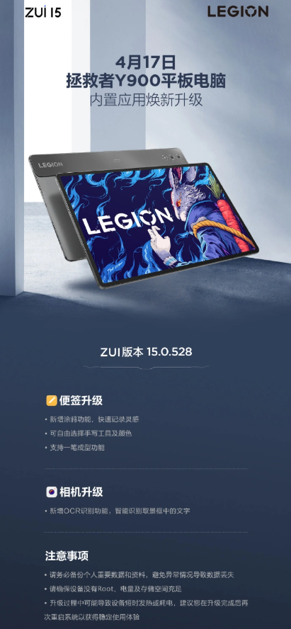 4 月 17 日消息,联想官方宣布,拯救者 Y900 平板电脑推送 ZUI 15.0.528.内置应用焕新升级,本次更新带来了全新便签;新增相机 OCR 文字识别功能。升级方式为设置-关于平板电脑-系统更新,按提示完成升级。