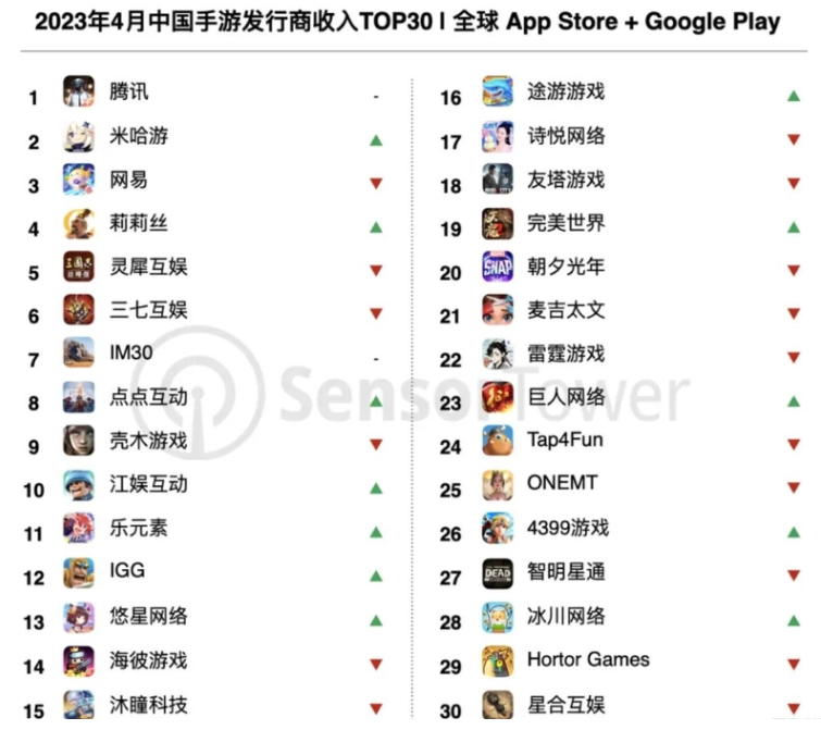 在 SLG 新游《Call of Dragons》在欧美收入大幅增长、《Dislyte》登陆日韩市场的推动下,莉莉丝 4 月收入环比增长 39%,达到 1 亿美元。榜单之外,入围全球收入 TOP100 的中国手游发行商依次是英雄游戏、柠檬微趣、Mattel163、游族网络、有爱互娱、竞技世界、友谊时光、波克城市、雅乐科技 和 多益网络 共 40 家厂商。