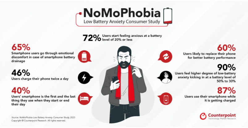 5 月 5 日消息,如果你的手机跳出低电提醒,你会感到焦虑吗?根据市场调查机构 Counterpoint Research 公布的最新报告,印度 72% 的智能手机用户对电量不足感到焦虑。