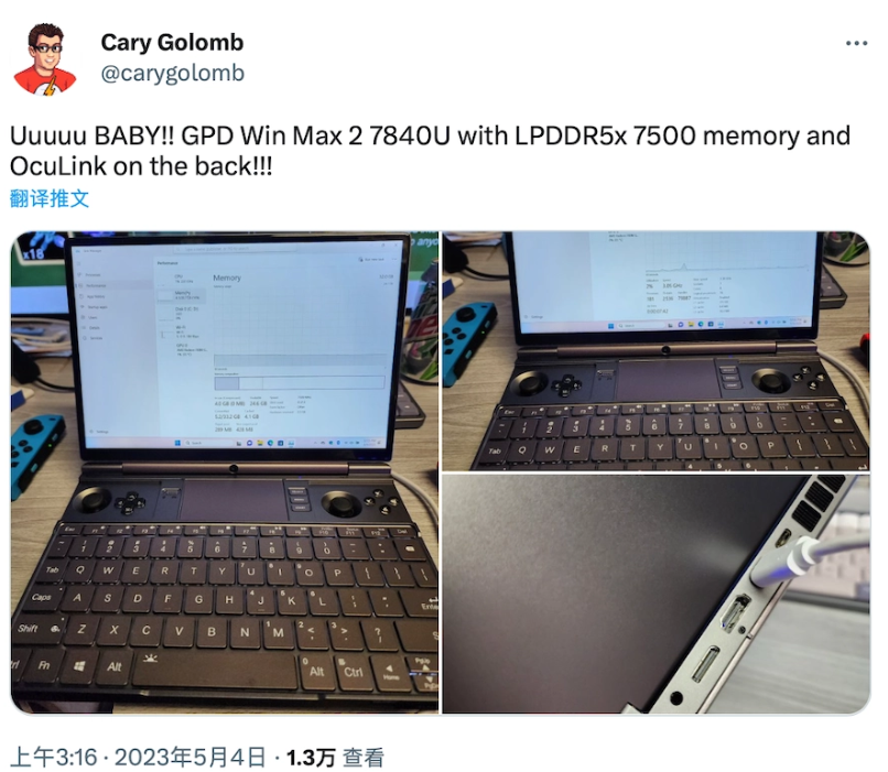 5 月 5 日消息,游戏机爱好者 Cary Golomb 曝光了 GPD 新款 Win Max 2 掌机。这款新掌机配备了 AMD 最新的 R7 7840U 处理器,并搭载了 OcuLink 显卡坞接口。