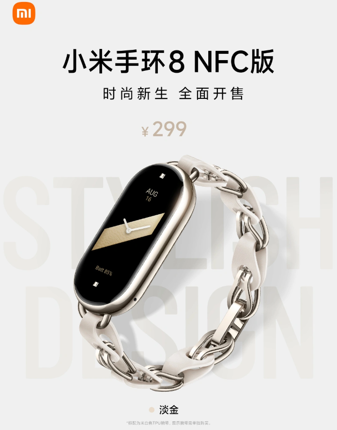 5 月 11 日消息,小米今日宣布,小米手环 8NFC 淡金色全面开售。这款新品采用全新淡金色中框,可带来精致的金属质感;标配米白色 TPU 腕带,采用快拆结构,支持公交地铁刷卡,定价 299 元。