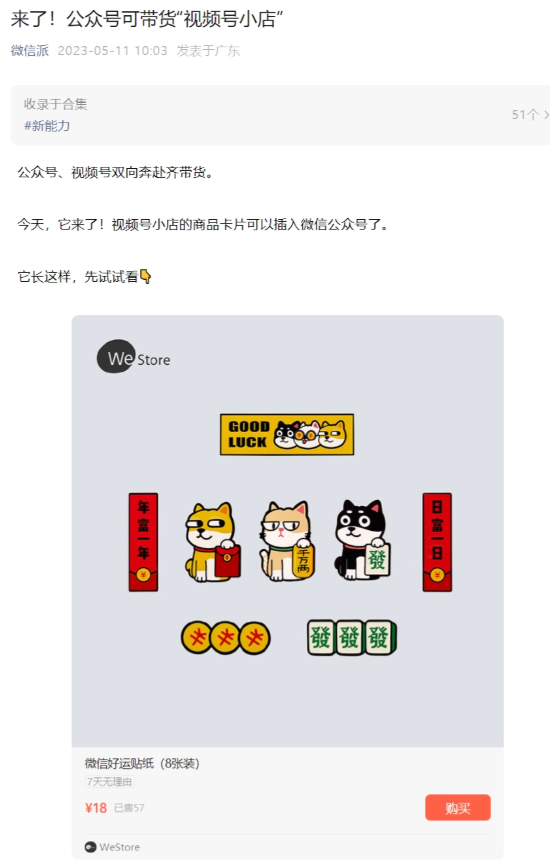 5 月 11 日消息,据微信官方号“微信派”宣布,公众号可带货“视频号小店”,视频号小店的商品卡片可以插入微信公众号了。