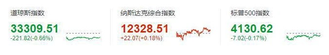 道琼斯指数收于 33309.51 点,下跌 221.82 点,跌幅 0.66%,连续 4 个交易日下跌;标准普尔 500 指数收于 4130.62 点,跌幅 0.17%;纳斯达克指数收于 12328.51 点,涨幅 0.18%。