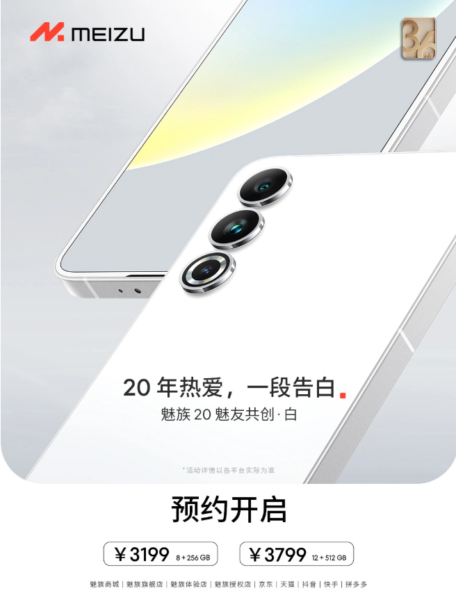 5 月 18 日消息,白色面板可以说是魅族的执念,而魅族 20 系列现在也推出了纯白版本,命名为“魅友共创・白”,8+256 和 12+512GB 版本分别为 3199 元和 3799 元,现已上架各大平台,将于 5 月 23 日晚 8 点抢先预售。