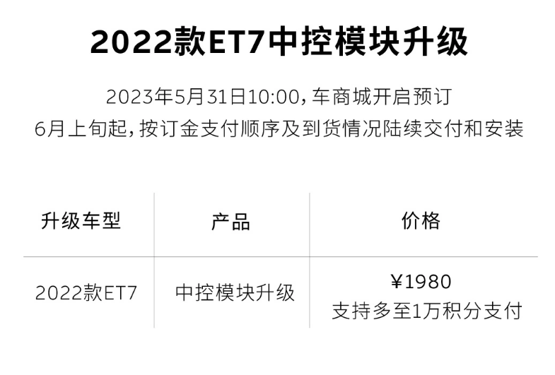 5 月 18 日消息,蔚来正式推出 2022 款 ET7 中控模块升级方案。此次升级将于 5 月 31 日 10 点正式在商城开放,不过车主需花费 1980 元,最高支持 1 万积分支付。