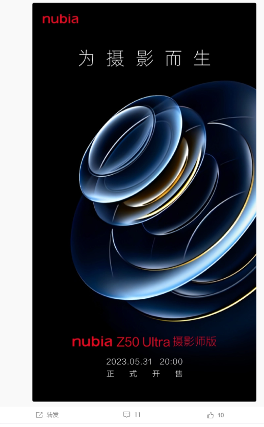 5 月 25 日消息,努比亚手机官方微博表示,努比亚 Z50 Ultra 摄影师版将于 5 月 31 日 20:00 正式开售,海报显示该机将主打影像。
