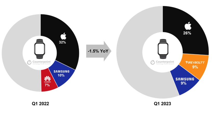 印度品牌 Fire-Boltt 首次超越三星,在全球市场排名第二。与上一年相比,其出货量增长了约三倍,与上一季度相比增长了 57%。