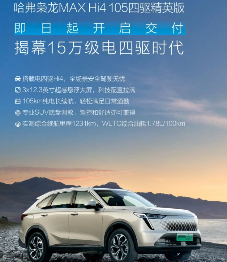 原标题:哈弗枭龙 MAX Hi4 105 四驱精英版车型开启交付,15.98 万元