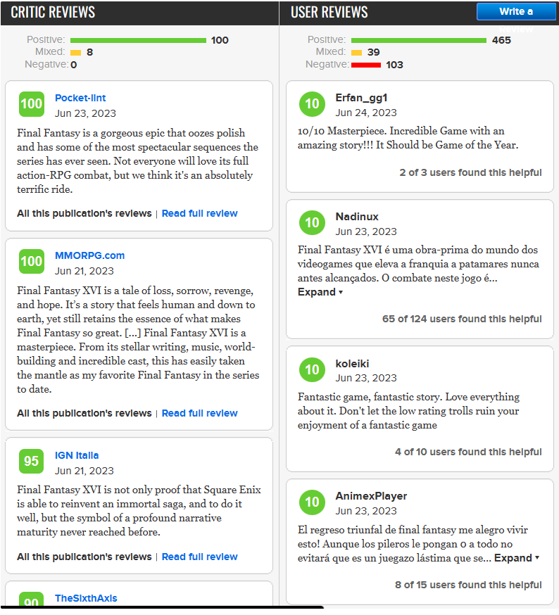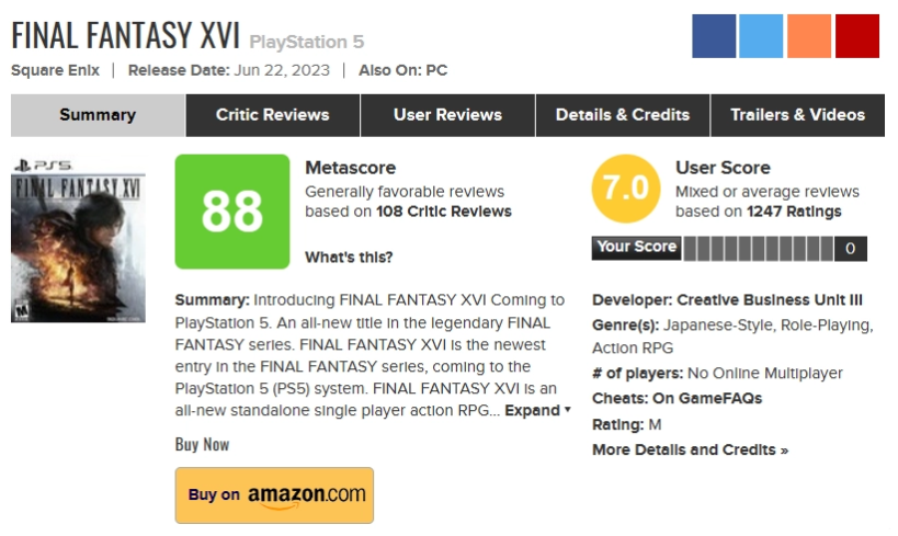 6 月 25 日消息,《最终幻想 16》于 6 月 21 日发售,目前 M 站评分已解禁,媒体评分 88 分,用户评分 7 分。用户评论共 1247 条,其中 465 条好评,103 条差评。