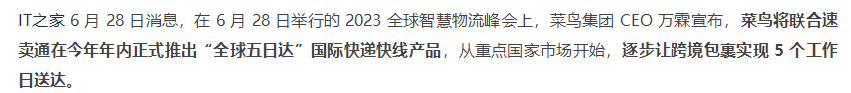 6 月 28 日消息,在 6 月 28 日举行的 2023 全球智慧物流峰会上,菜鸟集团 CEO 万霖宣布,菜鸟将联合速卖通在今年年内正式推出“全球五日达”国际快递快线产品,从重点国家市场开始,逐步让跨境包裹实现 5 个工作日送达。