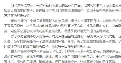 时光序衡温空调,一款引领行业潮流的革命性产品,以其独特的离子发生器应用,彻底改变了传统空调的概念。搭载高效高能量离子发生器,这款空调能够释放出高浓度的离子,迅速破坏空气中的病毒和细菌结构,实现全屋空气的循环净化。与此同时,格力空调的杰出特点之一便是它的静音运行,为用户营造了无声净爽的舒适体验。