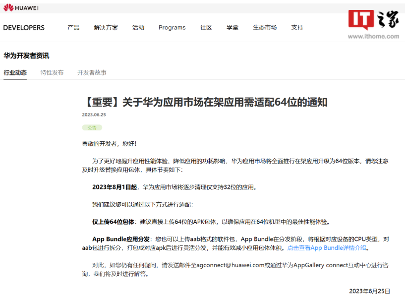 公告称,2023 年 8 月 1 日起,华为应用市场将逐步清理仅支持 32 位的应用,请开发者注意及时升级替换应用包体。