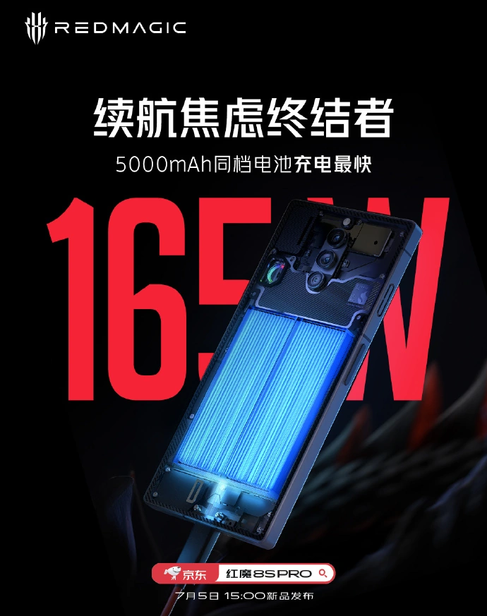 预热信息显示,红魔 8S Pro 手机还将支持 165W 有线快充,官方宣称 14 分钟即可充满,该成绩为“5000mAh 同档电池充电最快”。