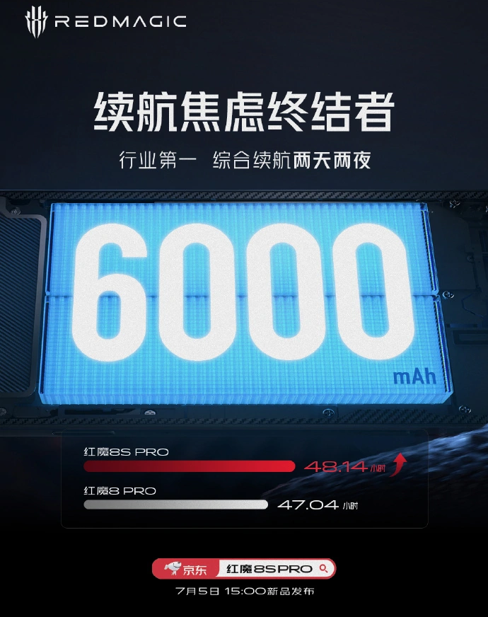 6 月 29 日消息,红魔 8S Pro 游戏手机官方宣布将配备 6000mAh 大电池,号称“综合续航超两天两夜,行业第一”。