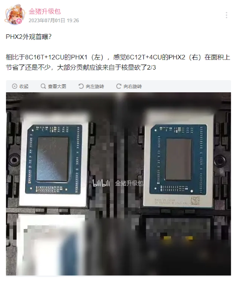 up 主 @金猪升级包 放出了最新的 Phoenix2 外观实拍图。从图中大家可以清楚看到,相比于左边的 8C16T+12CU 的 Phoenix,右边 6C12T+4CU 的 Phoenix2 在面积上小了很多。