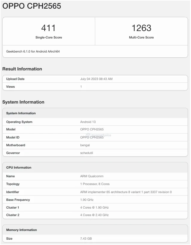 7 月 5 日消息,消息称 OPPO 计划 7 月 7 日发布 A78 4G 手机,正式发布之前该机已现身 GeekBench 跑分库,6.1 版本单核成绩为 411 分,多核成绩为 1263 分。