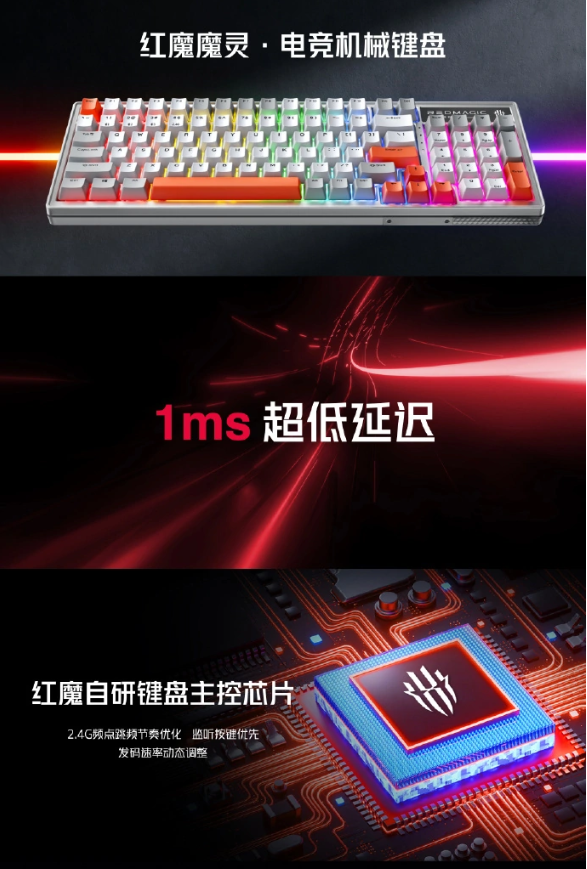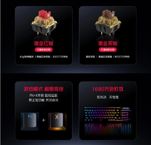 提醒,该产品搭配红魔智控软件驱动可实现键盘功能自定义,并且配备了 1680 万色 RGB 炫彩灯效。