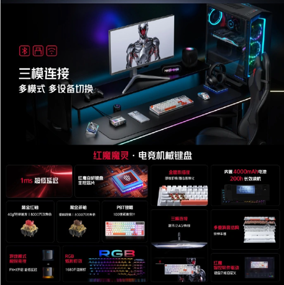 红魔魔灵电竞机械键盘支持全键热插拔,可即拔即换;内置 4000mAh 电池,续航可达 200 小时;采用 PBT 键帽(100 键)以及多重消音结构。