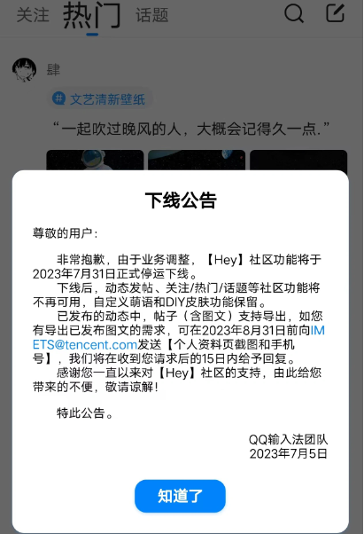 原标题:QQ 输入法 Hey 社区功能 7 月 31 日下线