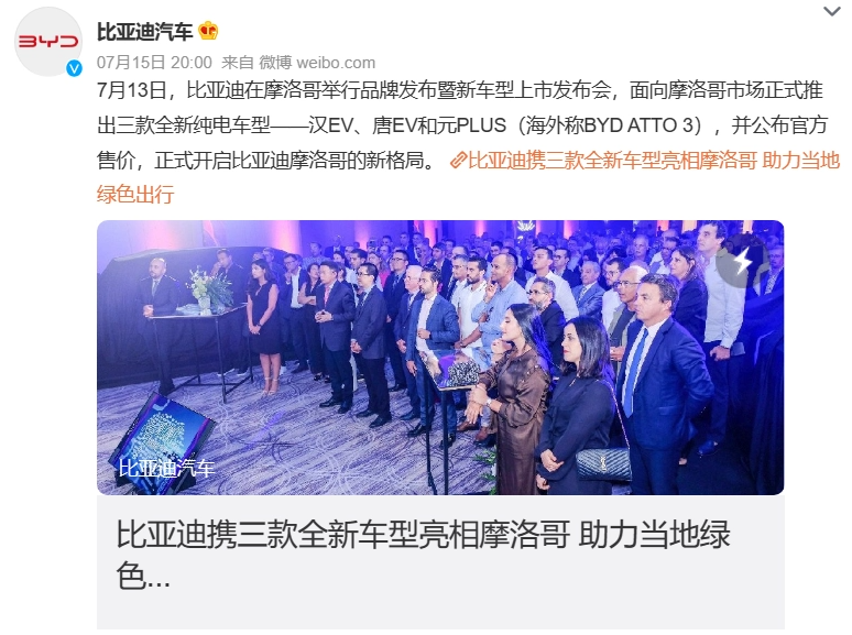 7 月 16 日消息,比亚迪在摩洛哥举行品牌发布暨新车型上市发布会,面向摩洛哥市场正式推出三款全新纯电车型 —— 汉 EV、唐 EV 和元 PLUS(海外称 BYD ATTO 3),并公布官方售价。