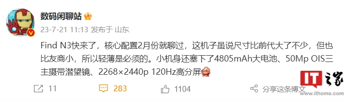 该博主透露,OPPO Find N3 在轻薄机身内塞下 4805mAh 大电池,搭载 5000 万像素 OIS 三摄,其中包括一颗潜望镜头。此外,该手机配备 120Hz 高刷新率显示屏,分辨率为 2268×2440p。