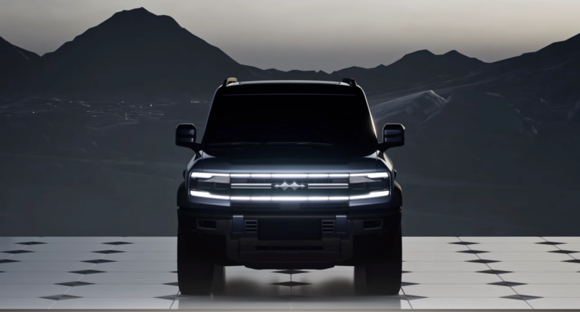 此次发布的视频,几乎将这款新车的外观完全展示了出来。新车采用硬派 SUV 常见的方盒子造型,前脸并未采用时下新能源车常见的封闭式设计,而是配备了一条较为粗壮的镀铬饰条,方程豹品牌 LOGO 镶嵌其中,从视频中可以看出,该车大灯组整体点亮后将整个中网部分以矩形包围,视觉效果较强。此外,新车配备了厚实的前保险杠和下包围。