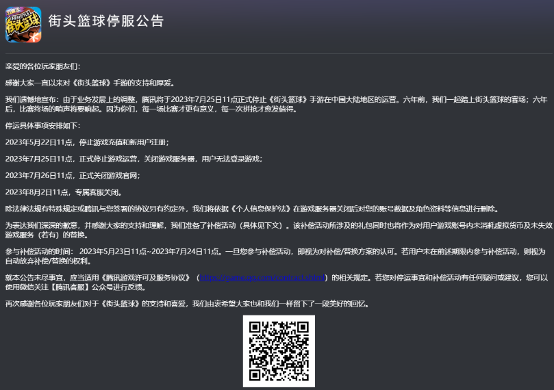根据官方公告,由于业务发展上的调整,腾讯将于 2023 年 7 月 25 日 11:00 正式停止《街头篮球》手游在中国大陆地区的运营。