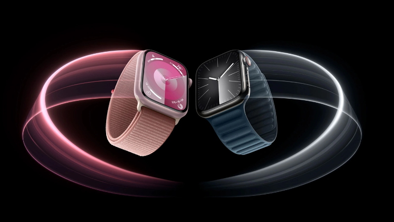 Apple Watch Series 9 提供 41 毫米和 45 毫米两种尺寸,星光色、午夜色、银色、红色及全新粉色铝金属表壳,以及金色、银色和石墨色不锈钢表壳。