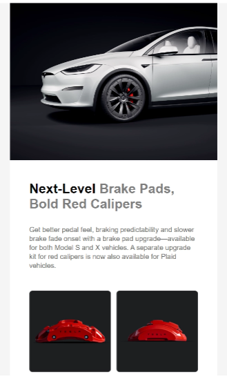 据介绍,新套件具备更高热容量的刹车片和红色 HTC 卡钳套件。升级的刹车片套件适用于 Model S 和 X,定价 750 美元(IT之家备注:当前约 5475 元人民币),而红色卡钳则适用于 Model S 或 Model X Plaid 版,定价为 2700 美元(当前约 19710 元人民币)。