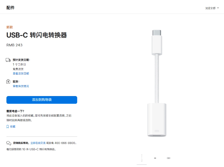 从官网页面得知,该转换器预计发货日期为 1 个工作日,今天就可以下单购买,由于闪电接口传输速率为 USB 2.0.因此该转换器预计也将提供 USB 2.0 的接口性能。