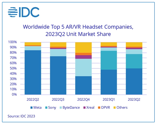 然而,该公司确实面临着来自索尼(27.1% 的市场份额)和字节跳动(9.6% 的市场份额)的挑战,这两家公司在 2023 年第二季度的市场份额都有所增加。排在前五位的是 Xreal(以前的 Nreal)和 DPVR,它们的份额都略高于 2%。