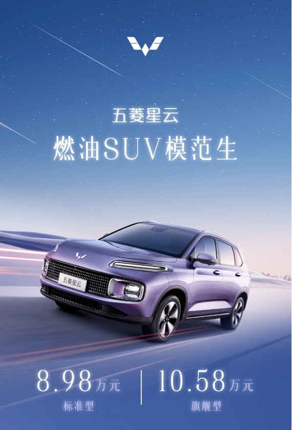 9 月 20 日消息,五菱星云汽车官宣今日上市,推出标准型、旗舰型两款配置,官方指导价分别为 8.98 万元、10.58 万元,定位 5 座油电混动紧凑型 SUV。