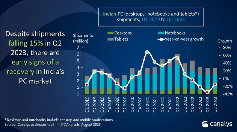 9 月 21 日消息,根据市场调查机构 Canalys 公布的最新报告,2023 年第 2 季度印度 PC(台式机、笔记本电脑和平板电脑)出货量为 390 万台,同比下降 15%,环比增长 2%,呈现复苏迹象。