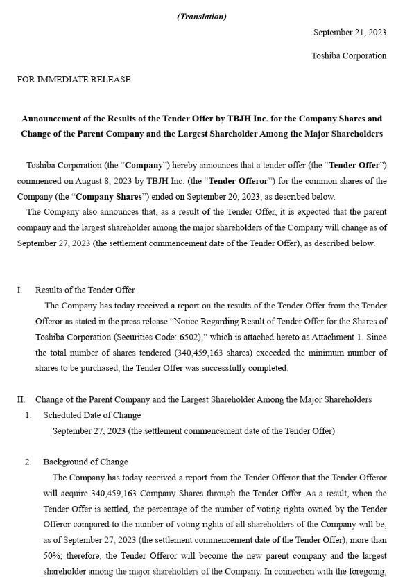 9 月 21 日消息,据东芝公司官网新闻稿,日前超过一半的股东参与了由私募股权基金日本产业伙伴公司(JIP)牵头的 135 亿美元(IT之家备注:当前约 985.5 亿元人民币)收购交易,达到了将公司私有化的门槛,从而结束了其 74 年的上市实体历史。