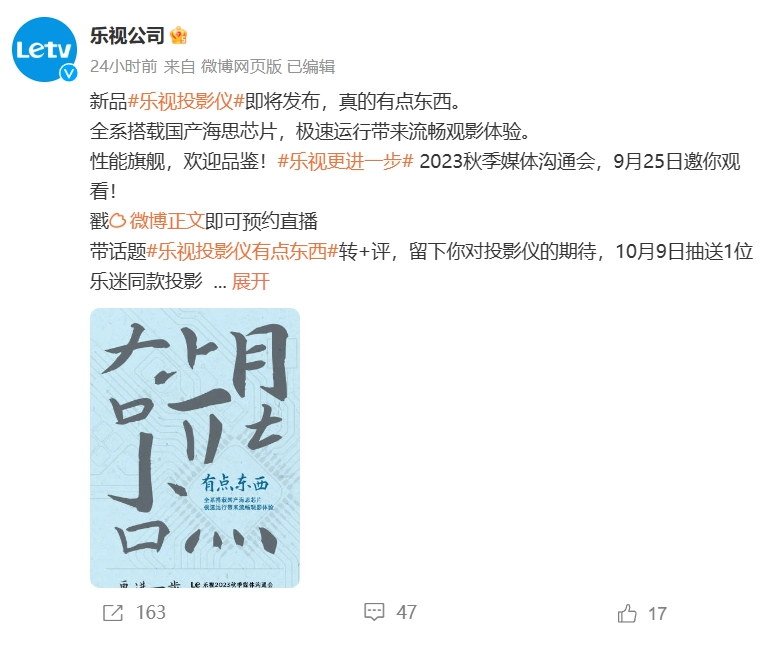 9 月 21 日消息,乐视宣布将于 9 月 25 日在北京举行“乐视 2023 秋季媒体沟通会”,这一天也是华为秋季新品发布会的时间。