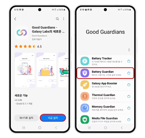 1.访问 Galaxy Store,下载 Good Guardians 应用程序,选择打开“Battery Guardian”。