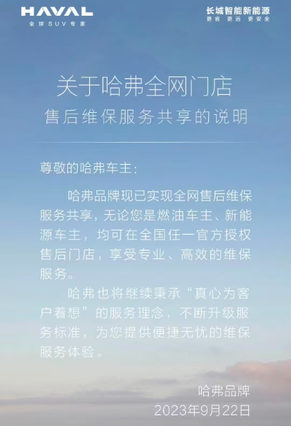9 月 23 日消息,哈弗 SUV 发布公告,宣布哈弗品牌现已实现全网售后维保服务共享,燃油车主、新能源车主均可在全国任一官方授权售后门店,享受专业、高效的维保服务。