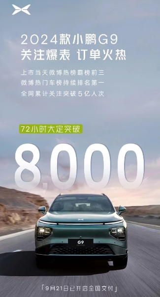 9 月 23 日消息,小鹏汽车宣布 2024 款小鹏 G9 车型 72 小时大定破 8000 辆,9 月 21 日已开启全国交付。
