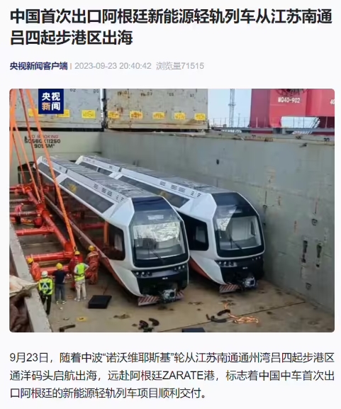 9 月 24 日消息,据央视新闻报道,随着中波“诺沃维耶斯基”轮从江苏南通通州湾吕四起步港区通洋码头启航出海,远赴阿根廷 ZARATE 港,标志着中国中车首次出口阿根廷的新能源轻轨列车项目顺利交付。