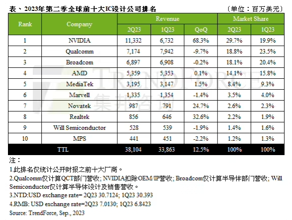 9 月 24 日消息,Trendforce 集邦咨询最新研究报告显示,得益于 AI 热潮,英伟达第二季度取代高通正式登上全球 IC 设计龙头,其余厂商排名并无波动。